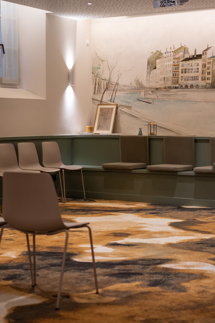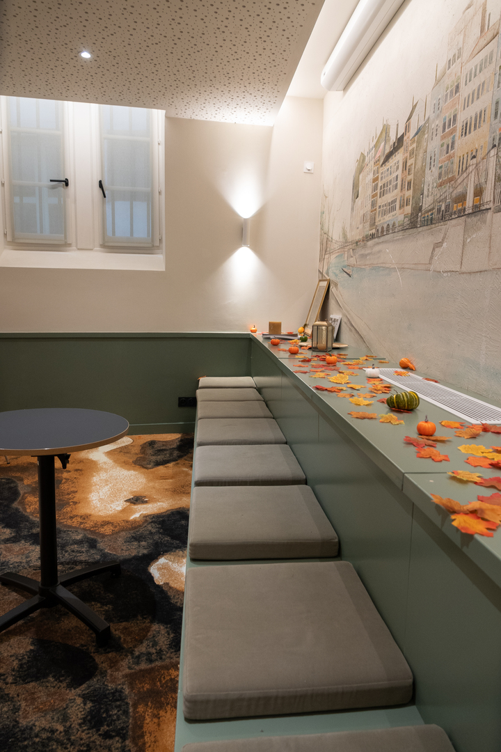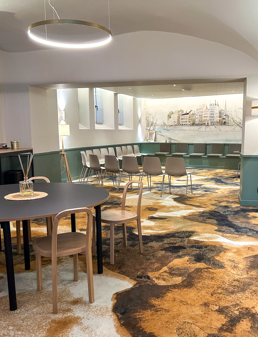 Sheltered from prying eyes in its old stone walls, this pretty lounge reveals a handmade mural, meticulous woodwork, soft colors, jars of delicacies and baskets of seasonal fruit.